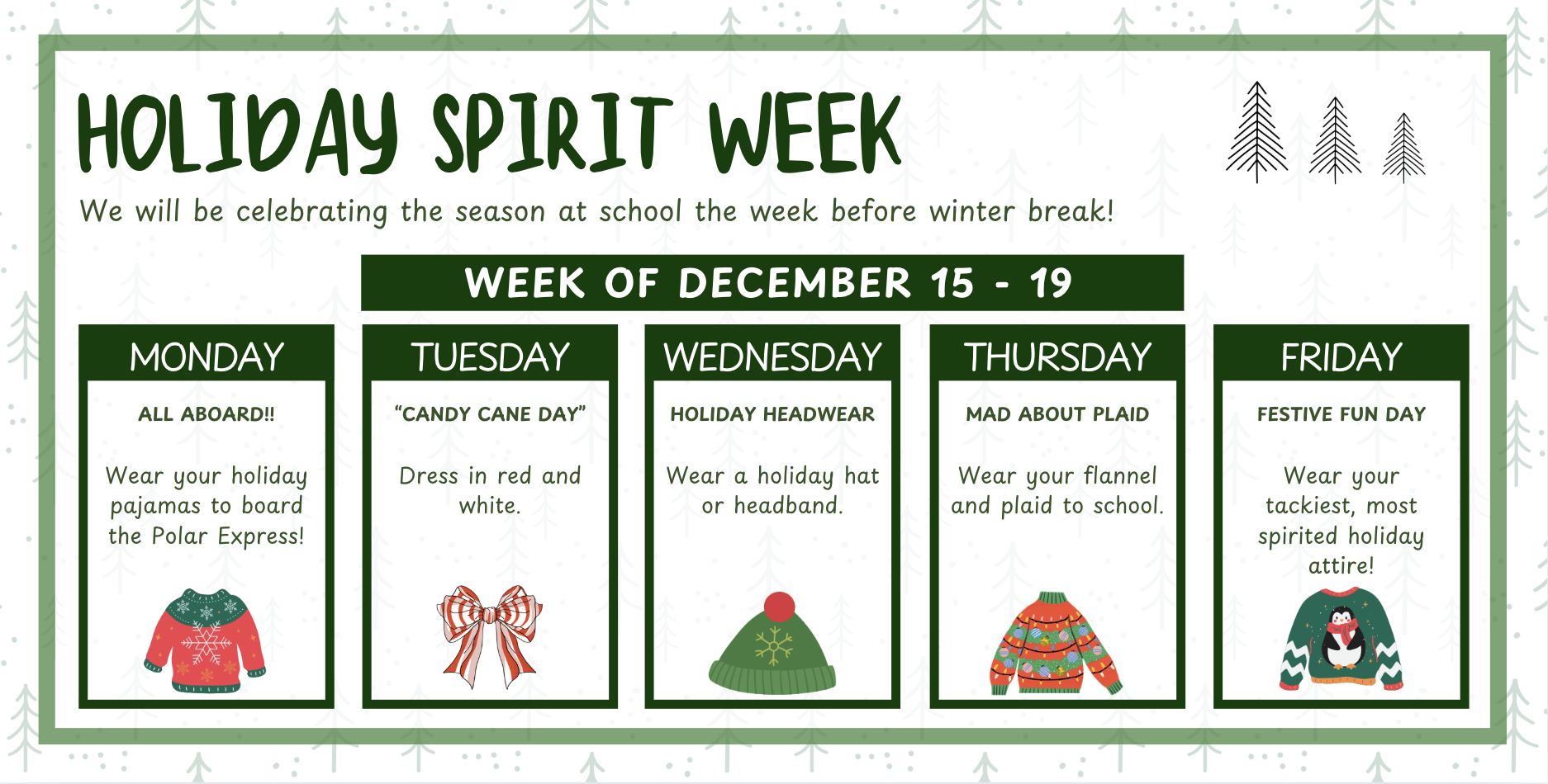 Thursday, December 11th - Polar Express Math/STEM Night 6-7:30pm - Monday, December 15th - Friday, December 19th - Holiday Spirit Week